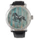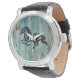 Esta é uma única "One of a Kind" Horse Watch! Ele apresenta uma Silhueta de Cavalo Negro galopante em um fundo de Turquesa e de madeira estressada de bronzeado! Design de Arte Original Do Artista Kerry Miller!