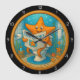 Esta imagem é um relógio de parede circular com uma borda preta e números brancos. A cara do relógio apresenta uma ilustração esbranquiçada de um peixe-estrela laranja sorridente vestindo óculos de ronco e lendo um jornal chamado "TEMPOS DE PEIXE" enquanto sentado em um banheiro submerso. A cena submarina inclui paredes azuis, algas, e vários peixes-estrela no "chão do mar", com bolhas flutuando ao redor do peixe-estrela, tudo contido dentro de uma armação interna do ouro.