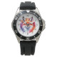 Relógio de ilustração da cor da água da raposa com um espalhador de tinta abstrato em vermelho, roxo, laranja e azul.