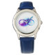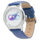 Símbolo infinito com uma bela pena pintada em cores roxas e azuis brilhantes sobre fundo branco.