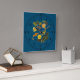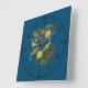 Koi nadando entre sapos lírios e flores. Peixe amarelo, laranja e marrom nadando entre as folhas verdes e flores amarelas dos lírios. Um fundo azul-marinho escuro. Arte original de Susan Lilly