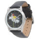 Relógio divertido com uma foto de uma margarida com uma joaninha contra um fundo preto com pontos amarelos por horas.