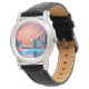 Um relógio com uma bela design gráfica apresentando um lago pacífico com veados. e pinheiros altos sendo refletidos na água. Estrelas sobrepõem-se.