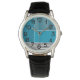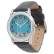 Este relógio masculino tem uma design geométrica de um retângulo alto grande no canto superior esquerdo, listras mais escuras no canto superior direito, um retângulo menor mais claro sob as listras e linhas pretas na parte inferior. Se você gosta do design, mas prefere cores diferentes, me mande mensagem.