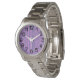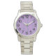 Este relógio feminino tem um design art déco que se assemelha a um circuito impresso. As linhas são verticais em turquesa num fundo roxo. Quer uma cor diferente? Envie-me uma mensagem.