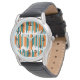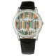 Este relógio masculino tem um padrão de linhas em cor de lágrima e laranja em comprimentos variados.