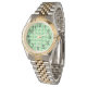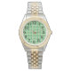 Este relógio feminino tem uma design moderna do século médio de linhas verdes verticais com retângulos acima, repetidos sobre a design.