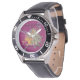 Lion Papercut Men's Leather Watch. A sophisticated timepiece featuring detailed papercut art of a roaring lion at sunrise by the sea on its dial. Crafted with a stainless steel case, genuine leather strap, and reliable Japanese quartz movement. Water-resistant up to 100m. Customize with text for a distinguished personal accessory.