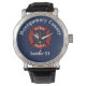 design de na moda para bombeiros e suas famílias, apresenta o logotipo do corpo de bombeiros genérico vermelho em fundo azul escuro. Personalizar com detalhes do departamento da cidade ou do condado ou nome de bombeiro em fonte branca moderna