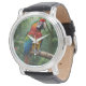 Este belo relógio apresenta um papagaio de arara colorido numa selva mágica.