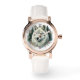 Esta imagem mostra um relógio de pulso maravilhosamente desenhado, com uma ilustração impressionante da cabeça de um lobo no rosto do relógio. O relógio tem uma caixa de rosa e uma correia branca de couro, acrescentando um toque de elegância ao design do lobo robusto. Os números na discagem estão em uma fonte serif clássica, melhorando a aparência sofisticada geral. Este relógio combina a beleza selvagem da natureza com o refinado artesanato, fazer-o um acessório único para aqueles que apreciam tanto o estilo como o excelente ao ar livre.
