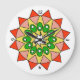Mandala em vermelho, rosa, verde, amarelo. Os diamantes vermelhos e cor-de-rosa delimitam o círculo externo. Dentro são ovais verdes com pontos brancos numa estrela amarela. No centro está uma forma espiral branca. Os números 12, 3, 6 e 9 estão localizados sobre um fundo branco entre os triângulos vermelhos que apontam para o exterior.