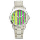 Este relógio feminino tem um simples design Mardi Gras de faixas verticais em amarelo, verde e roxo.