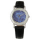 Um rosto margarida azul e roxo sorrindo do seu pulso