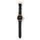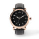 This men's rose gold color vintage watch is shown with a black color face with white numbers.