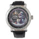 A charming winter scene featuring a snowman wearing a purple plaid hat and scarf, standing next to a lamppost. A small red cardinal is perched in the snowy foreground, and a sign on the lamppost reads MERRY AND BRIGHT. The background is a snowy village with falling snowflakes and bare trees. The artwork is presented on a round, silver-toned item with numerical markings around its edge, capturing a cozy holiday atmosphere.