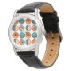 Este relógio tem uma design moderna do século médio de meio círculo em cor de rosa e cor de laranja com metade de um estouro em alguns e minúsculos círculos repetitivos em outros.