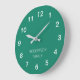Este relógio Emerald Green Wall, moderno e minimalista personalizado, é fácil de personalizar digitando seu nome de família ou texto similar na modelo de personalização antes de fazer pedidos. O design apresenta os números e a personalização em branco sobre um simples fundo verde-esmeralda simples, para que o tempo possa ser facilmente visto por adultos e crianças.