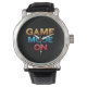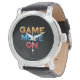 O design apresenta a frase "Game Mode On" em uma fonte ousada, sans- serif, renderizada em uma paleta vibrante de cores elegantes. As palavras estão dispostas em uma composição dinâmica, diagonal, criando um sentido de energia e entusiasmo.
