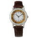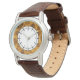 Este relógio de excelente apresenta uma face branca rodeada por um desenho abstrato de círculos steampunk castanho-ouro com uma aflição, textura, sensação de granizo. A design também lembra os padrões de uma girafa!
