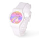 Belo Rainbow Glitter Trendy Monograma Watch. Ele foi projetado com um unicórnio branco e um fundo brilhante bonito do arco-íris. Personalizado com o nome da criança em um script escrito à mão preto na parte superior da área. Perfeito para o presente de aniversário de unicórnio de uma menina! Clique na opção personalizar modelo e siga o prompt.
