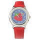 Morango de desenho animado adorável com smiley face no relógio de criança personalizado, azul e vermelho, com números fáceis de ler.