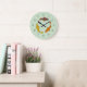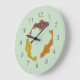 Koi nadando em círculo dentro do anel de algarismos romanos. Os peixes são laranja, amarelo e marrom-alaranjado. O número é prata com uma aparência tridimensional. Fundo em verde pálido.