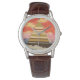 Os céus cor de laranja Brilhante são iluminados nesta trabalho de arte pintada à mão de um magnífico veleiro com uma vela riscada, atravessando águas cortadas e azuis oceânicas.