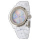 Um belo relógio Rinoestone White Enamel para mulheres com um nome monográfico em azul sobre a mãe de pérola.