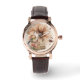 Esta adorável Rosa Dourada e Watch mostrada em couro marrom, mostra um pássaro fofo empoleirado em uma caixa de madeira rústica cercada por flores em um pano de fundo de gingham bege, criando uma cena pacífica e natural. O pássaro adiciona um toque de vida ao cenário enquanto a caixa de madeira lhe dá uma sensação confortável. Este relógio não é apenas um relógio, é um adorável acessório de moda que tem uma fazenda, estilo rústico, mas moderno!