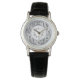 Dois círculos, um pequeno com numerais romanos sobre e um maior falso prateado com círculos nos quais aparecem números analógicos, são emoldurados por delicadas espirais pretas