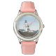 Este desenho apresenta um farol branco, verde e preto sobre o mar. O céu é azul com algumas nuvens. Casas brancas com telhados verdes cercando o farol. Esta design está disponível em mulheres, homens e relógios infantis.