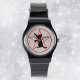 Este é um relógio que tem um gato preto de bruxa na silhueta procurando por uma estrela de ouro em um pentagrama vermelho dentro um círculo vermelho em um fundo de cinza de luz.