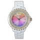 O presente da noiva de noiva favorita a noiva. Design glamouroso com bracelete branco e face de discagem colorida arco-íris gradiente. Adicione seu próprio nome personalizado e data, opcionalmente. Modelo de tipografia elegante com monograma personalizado. Presentes únicos para a tripulação de noiva, comitiva, madrinha de casamento, equipe, tribo, posse, florista, amigos, família, etc. Diâmetro em torno de 29 mm, precinta em torno de 18 mm. Moderno, não há face numérica com cores femininas como rosa e roxo. Bezel com pedras de cristal. O pulso luxuoso vigia as moças da moda.