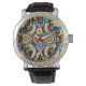 Este relógio masculino tem um design Bauhaus de diferentes grupos de círculos concêntricos em cores dos anos 70.