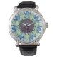 Vigia de correia preta de couro com uma imagem de um trabalho de arte digital criado com imagens de topaz azul em forma de diamante e pedras de peridot, triângulos esmeraldas, pérolas e fibras em um cenário de ornamentado. Consulte o botão redondo correspondente, charme redondo, chaveiro de metal grande redondo, chaveiro de acrílico de dupla face redonda, chaveiro de espiral e colar redondo. Veja a coleção inteira de Gemstones & Medallions Watch na seção ACESSORIES.