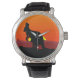 Um canguru australiano com uma joia de bebê em silhueta contra um pôr do sol de fora em laranjas brilhantes e vermelhos.
