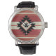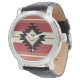 Padrão étnico boêmico asteca com formas geométricas em vermelho, laranja, cinza e cores pretas em fundo listrado