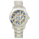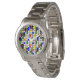 Este relógio feminino tem uma design moderna do século médio de uma grade com quadrados e retângulos coloridos. Também tem círculos coloridos colocados nas linhas de grade. Se você gosta do design, mas prefere cores diferentes, me mande mensagem.