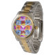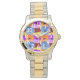 Este relógio feminino tem um Primavera de design de roxo, azul, laranja, e vermelho com pansias amarelas colocadas umas sobre as outras num campo de amarelo.