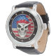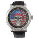 O Crânio Patriótico está vestindo um bandana em tons vibrantes de vermelho, branco e azul, colocados em frente à bandeira americana simbolizando o espírito americano.