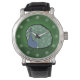 Um bonito e verde pavão de desenho animado observado por muitos olhos na cauda. Que pássaro engraçado e bonito!