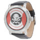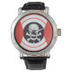 Essa design apresenta um crânio e bósforos no centro dos círculos concêntricos em cores de laranja e preto.