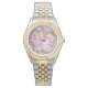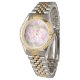 Este padrão tecido de design floral, floresce brilhante, em flores de tipo pedófilo, de rosa e branco, com folhas verdes destacadas, em cores de azeitona e marrom.
