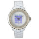 O relógio de pulso mostra a bandeira grega e a palavra, HELLAS, em azul. A bandeira mostra faixas azuis e brancas com uma cruz azul e branca na área superior direita. Acima dele, adicione seu nome, em letras azuis, para um toque personalizado ou crie um presente personalizado. Divertido para reuniões familiares, grupos viagem, e compartilhando seu amor e orgulho em sua herança, ancestralidade e cultura. Excelente para celebrar o Dia Oxi.