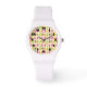 Um relógio desportivo com uma imagem de um padrão de verão com picolés e sorvetes em aquarelas. Cores coloridas vibrantes, como rosa e verde limão.