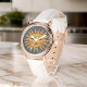 A face do relógio está na forma de um sol com feixes de luz radiantes. O sol é representado por um rosto sorridente, com olhos grandes, pintados, azuis-claros, e uma pincelada rosada e cor de pêssego em suas bochechas. A boca é um sorriso gentil. Os raios solares são de cor ouro-amarela, e o fundo, a base do relógio, é um marinho-azul escuro, sugestivo de uma prancha de madeira, com pequenas estrelas brancas pintadas espalhadas por ela.