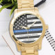 Celebre e mostre seu apreço a um excelente policial com este Thin Blue Line Retirement ou Anniversário da Polícia Vigia - design da bandeira americana na Polícia - cores em um design azul e preto moderno. Perfeito para prêmios de serviço e presentes de aposentadoria policial e aposentadoria polícia. Personalize este relógio de aposentadoria policial com nome e crachá nº, anos de serviço e de serviço, departamento de polícia. COPYRIGHT © 2020 Judy Burrows, Black Dog Art - Todos Os Direitos Reservados. Presente de Polícia - Presente Azul fino Sinalizador Dourado