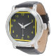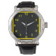 Você vai adorar esse relógio bonito com um rosto preto e amarelo-ouro e números amarelos.