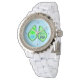 Este incrível relógio apresenta uma imagem gráfica de uma vagem verde de ervilha contendo 2 ervilhas verdes e uma grande ervilha azul. A grande ervilha azul tem um rosto bonito com olhos e boca. Do outro lado da ervilha, em texto rosa mais escuro, diz "Baby Boy Ready to Pop". A design é ideal para um anúncio ou chá de fraldas de gravidez. Há um grupo de pequenas ervilhas azuis no fundo.